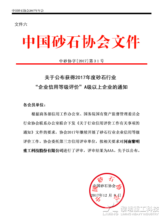 為逐步建立砂石行業(yè)信用體系,提升行業(yè)內(nèi)企業(yè)的信用管理水平,建立健全行業(yè)的工業(yè)化發(fā)展體制,中國砂石協(xié)會(huì)特開展砂石行業(yè)企業(yè)信用等級(jí)評(píng)價(jià)工作。2017年,根據(jù)商務(wù)部信用工作辦公室、國務(wù)院國有資產(chǎn)監(jiān)督管理委員會(huì)行業(yè)協(xié)會(huì)聯(lián)系辦公室聯(lián)合下發(fā)的《關(guān)于行業(yè)信用評(píng)價(jià)工作有關(guān)事項(xiàng)的通知 》文件要求,在企業(yè)自愿申報(bào)的基礎(chǔ)上,中國砂石協(xié)會(huì)本著“公開、公正、科學(xué)”的原則,嚴(yán)格按照信用等級(jí)評(píng)價(jià)程序,聯(lián)同第三方信用評(píng)審單位對(duì)黎明重工進(jìn)行了評(píng)估,評(píng)審結(jié)果為AAA。